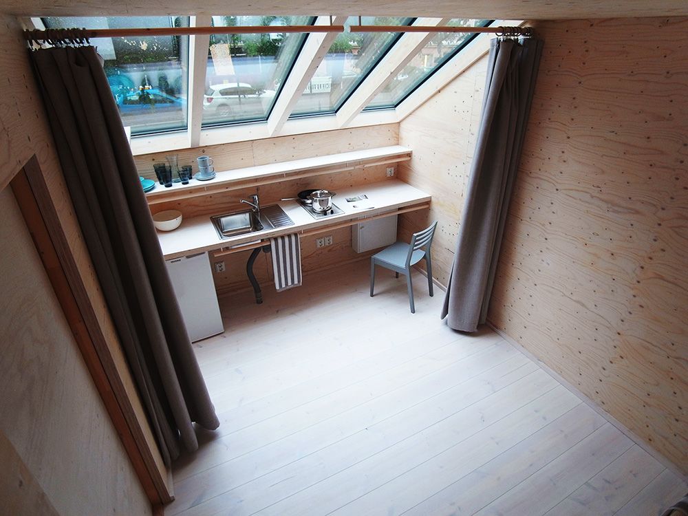 Kokoonin sisäseinät ovat käsittelemätöntä viilupuuta. (LVL). Kuva: Anne Kinnunen